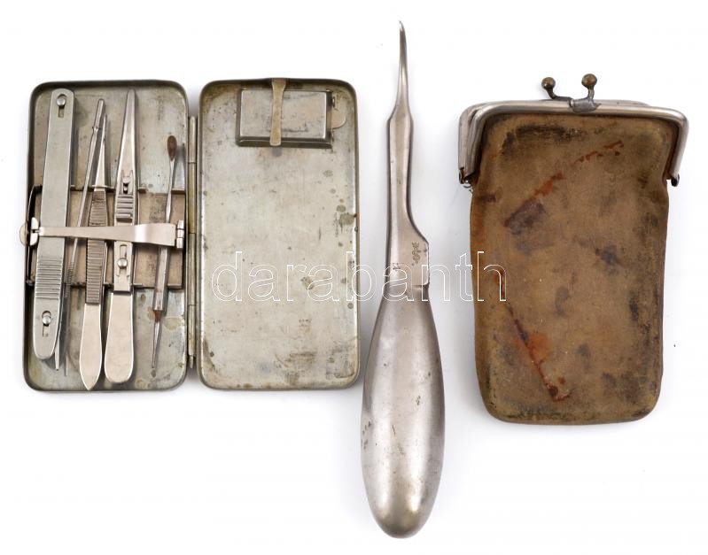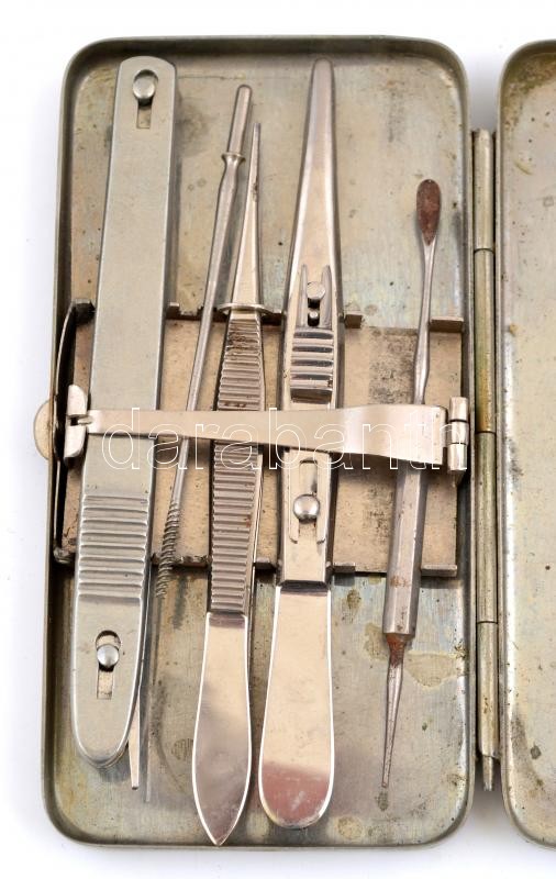 Leírás: Régi fém fogorvosi eszközök, részben fém tokban
