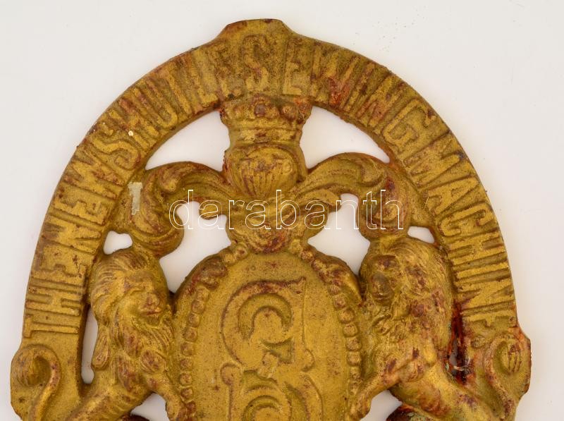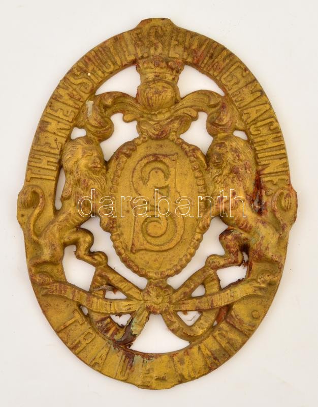 Leírás: The Newshutle Sewing Machine varrógép nagyméretű aranyozott vas embléma 27x20 cm