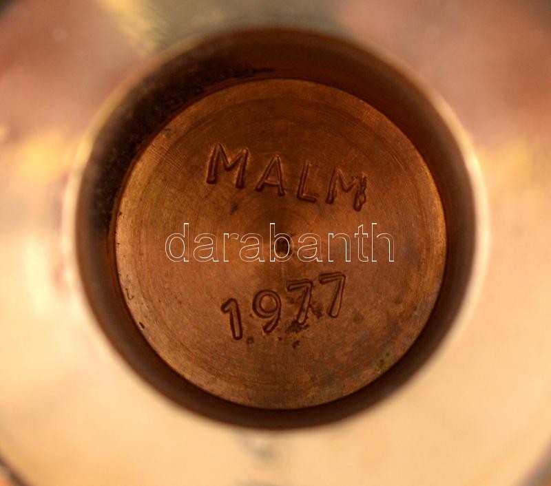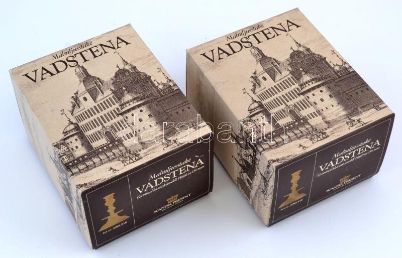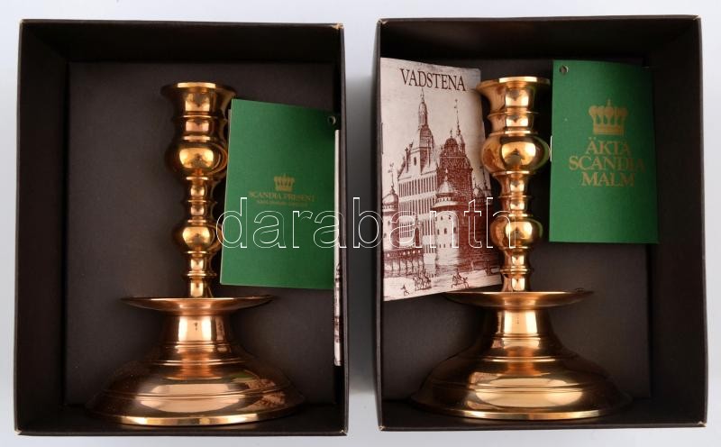 Leírás: Vadstena réz gyertyatartó párban, jelzett, eredeti dobozában, m:14 cm (2×)