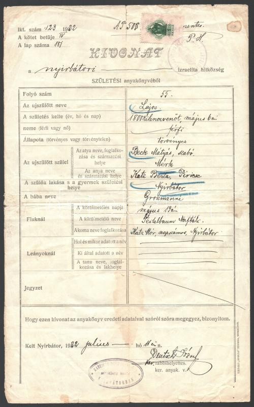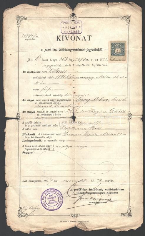 1889-1922 3 db izraelita születési anyakönyvi kivonat https://www.darabanth.com/hu/354-Gyorsarveres/354.0/Mutargy-papirregiseg-egyeb/Judaika~500025/1889-1922-3-db-izraelita-szuletesi-anyakonyvi-kivonat~II2023665