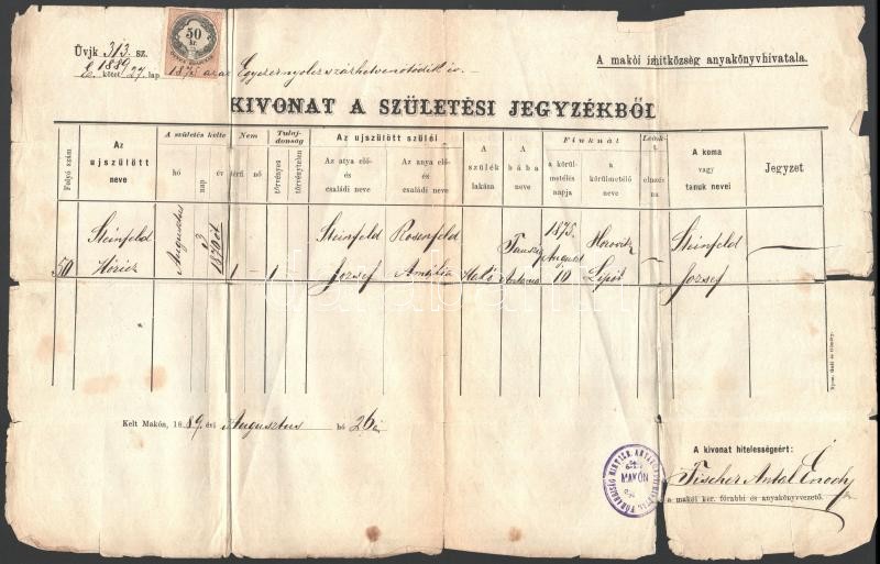 Leírás: 1889-1922 3 db izraelita születési anyakönyvi kivonat