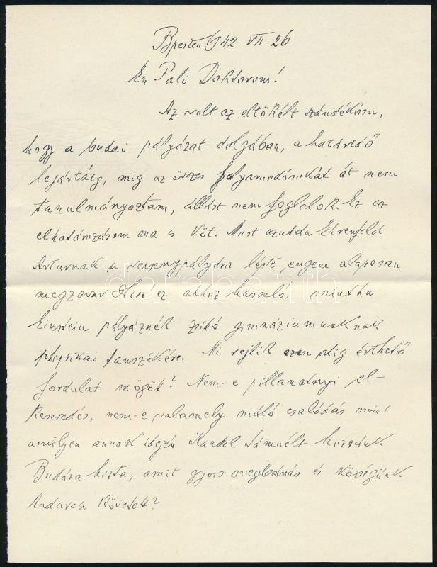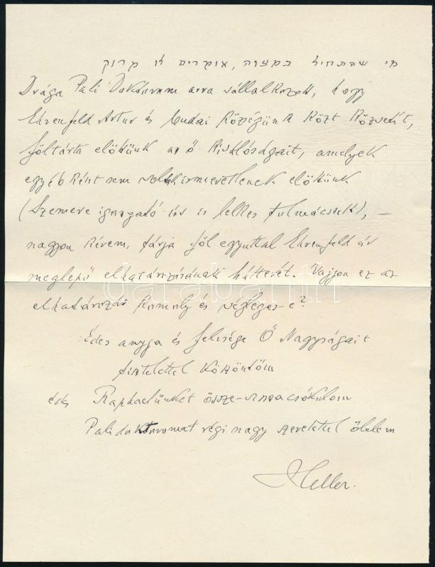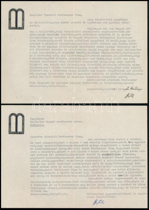 1942 Heller Bernát orientalista, rabbiképzői tanár saját kézzel írt levele a debreceni status quo ante hitközség vezetőjének Pali doktorom! megszólítással, melyben Ehrenfeld Artur budai pályázata ügyében válaszol. Hozza a hitközségi vezető két levele is.