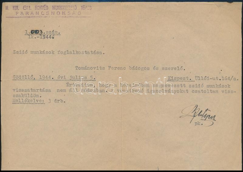 Leírás: 1944 Gödöllő, a m. kir. 611. honvéd munkavezető törzs parancsnok gépelt, aláírt levele Tománovits Ferenc bádogos-szerelőnek munkaszolgálatosokról
