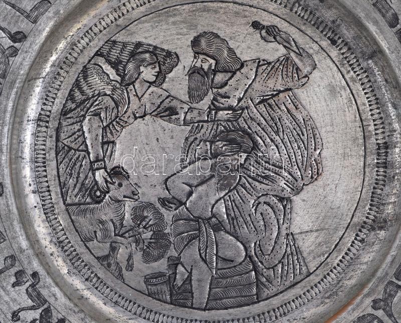 Leírás: Ábrahám feláldozza Izsákot, feliratos fém tányér, d: 21 cm