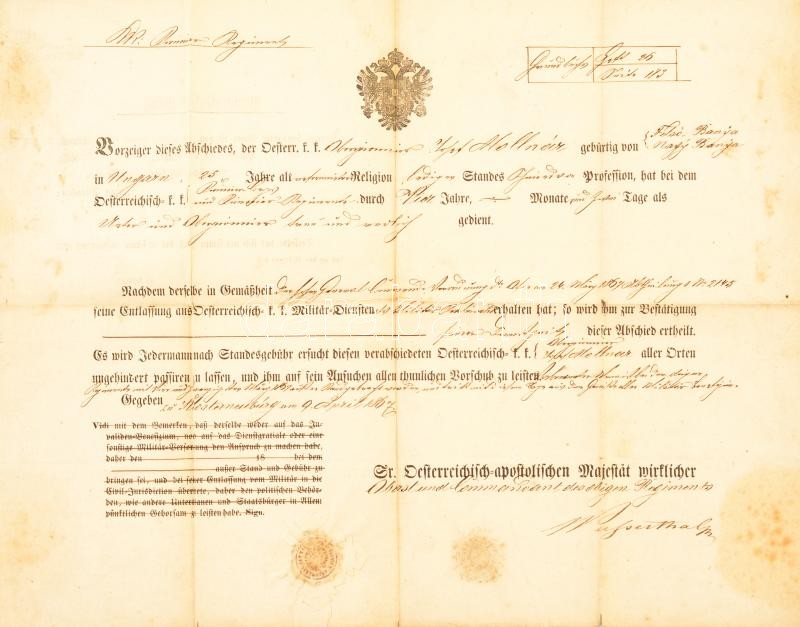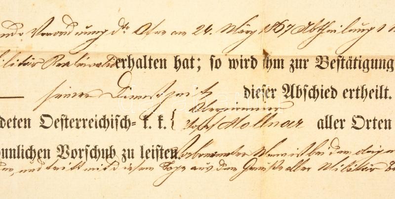 Leírás: 1867 Katonai végelbocsájtó levél, obsit magyar katona részére 49x38 cm