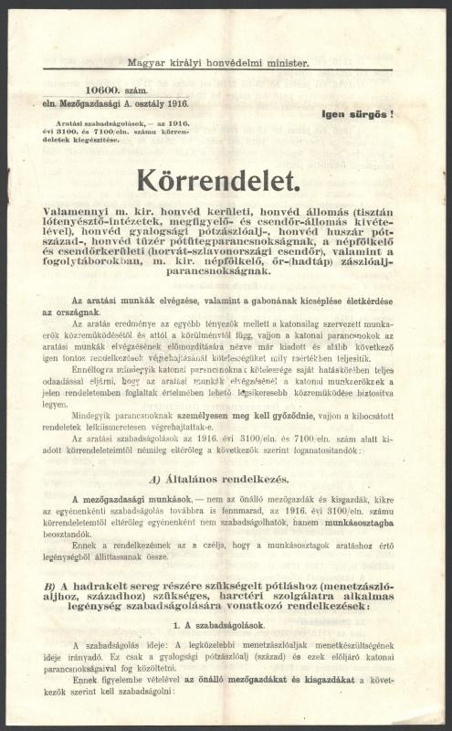 1916 Honvédelmi miniszter körrendelete az aratási szabadságról katonák... https://www.darabanth.com/hu/354-Gyorsarveres/354.0/Mutargy-papirregiseg-egyeb/Militaria~500028/1916-Honvedelmi-miniszter-korrendelete-az-aratasi-szabadsagrol-katonaknak-6p-plus-terkep-35x25-~II2023930