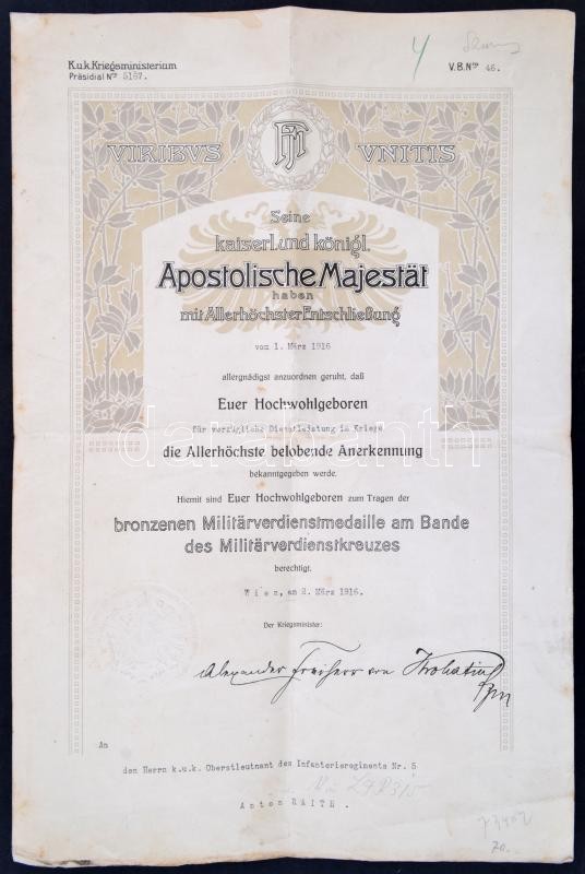 1916 Katonai szolgálati érem a Szolgálati érdemkereszt szalagján kitüntetés adományozó okirata Krobatin hadügyminiszter aláírásával / 1916 Austria, Arwarding document of the Military service medal