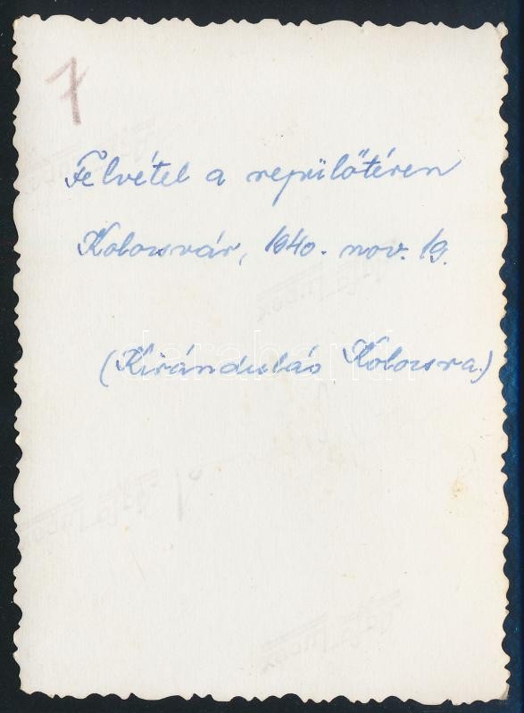 Leírás: 1940 Kolozsvár, katonák repülőgéppel, hátoldalon feliratozott fotó, 8,5×6 cm