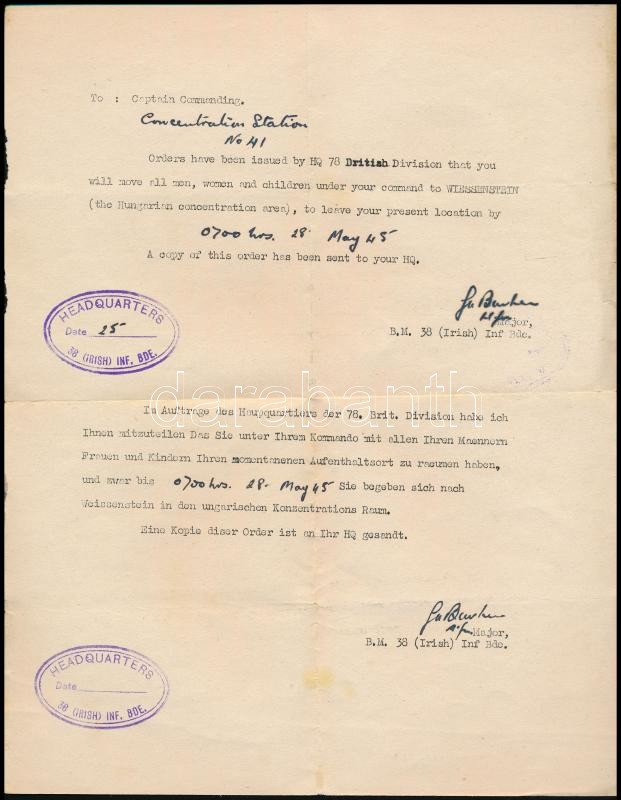1945 Tábor áthelyezéséről szóló német és angol nyelvű rendelkező irat https://www.darabanth.com/hu/354-Gyorsarveres/354.0/Mutargy-papirregiseg-egyeb/Militaria~500028/1945-Tabor-athelyezeserol-szolo-nemet-es-angol-nyelvu-rendelkezo-irat~II2019076