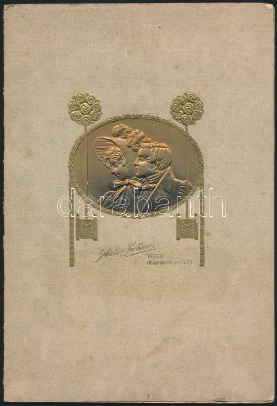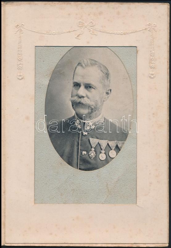 Leírás: cca 1910 Katona kitüntetésekkel, kép szecessziós dísztokban, 22×15 cm
