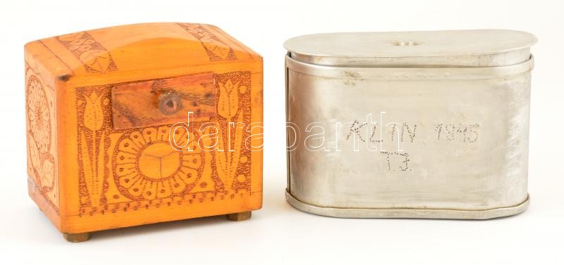 Leírás: cca 1945 "Klin 1945" feliratú alumínium hadifogoly csajka + "Diósgyőr 1934" feliratú fiókos fa dobozka, talán laktanyai emlék, javított
