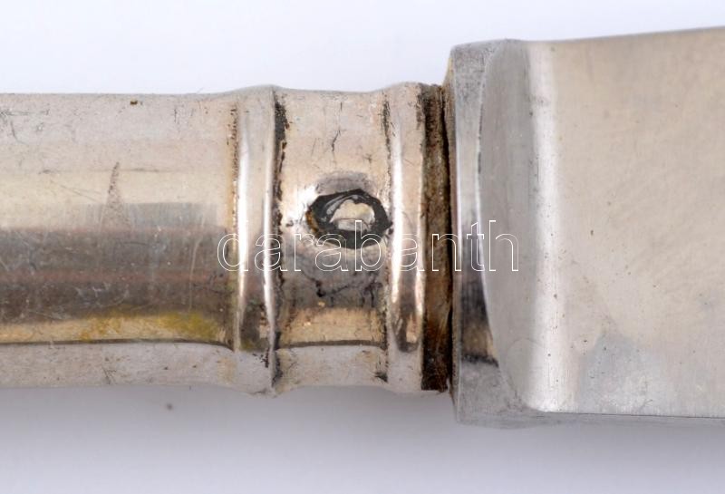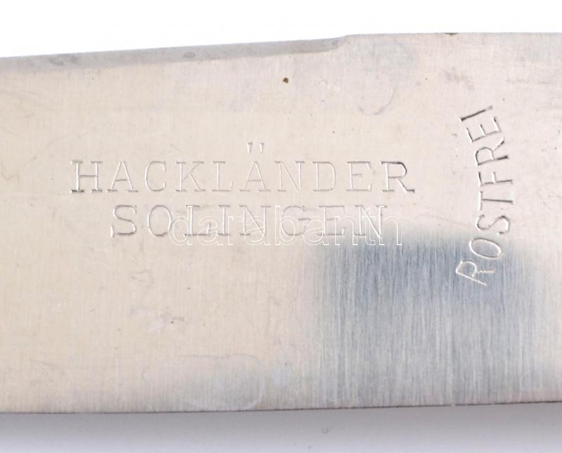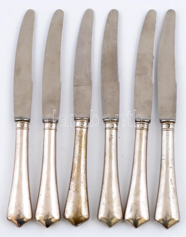 Leírás: Ezüst (Ag.) nyelű kés készlet (6db), jelzett, Hacklander Solingen pengékkel, egy db kimozdult a nyeléből, h:21,5 cm (6×), bruttó:352 g