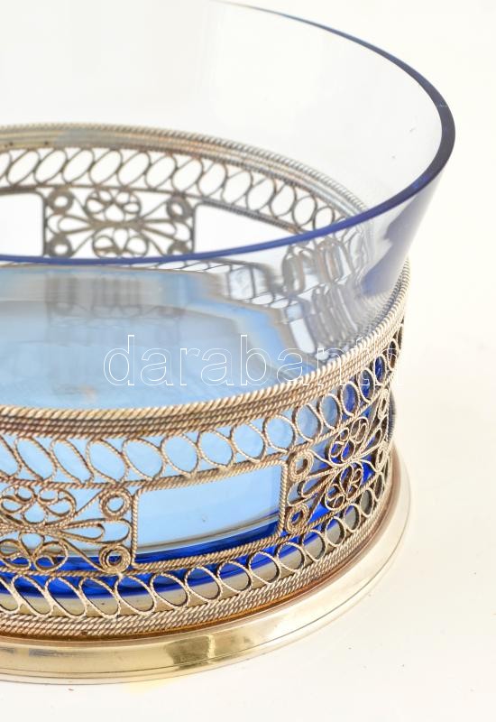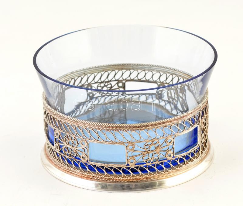 Leírás: Ezüstözött filigrán fém kínáló kék üvegbetéttel, d: 11,5 cm, m: 7 cm