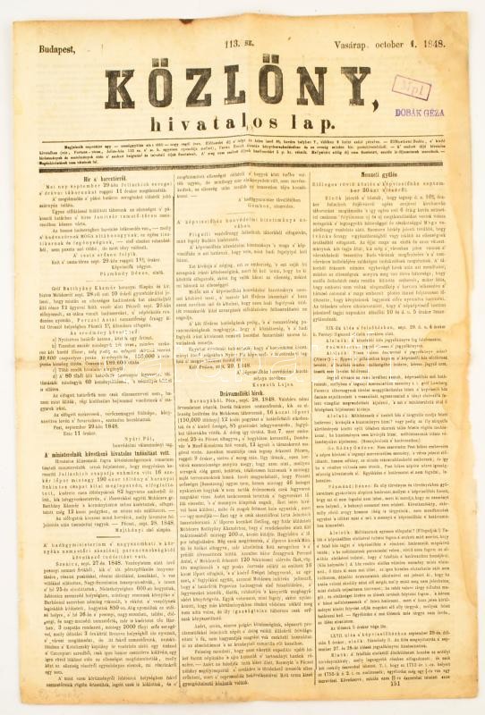 1848 Közlöny. Hivatalos lap, 1848. okt. 1. Szerk.: Gyurmán Adolf. Bp.,... https://www.darabanth.com/hu/354-Gyorsarveres/354.0/Mutargy-papirregiseg-egyeb/Nyomtatvanyok~500030/1848-Kozlony-Hivatalos-lap-1848-okt-1-Szerk-Gyurman-Adolf-Bp-M-K-Egyetemi-Nyomda-fol~II2019889