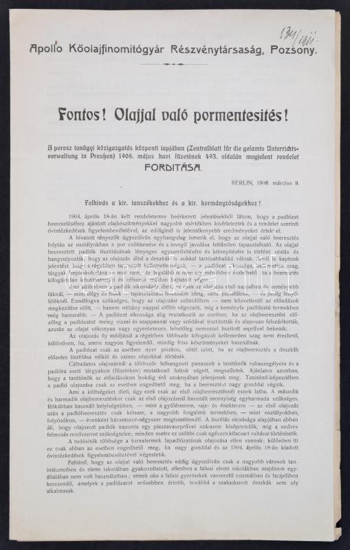 Leírás: 1908 az Apollo Kőolajfinomító Rt. hirdetménye közegészségügyi rendeletről, magyar és német nyelven