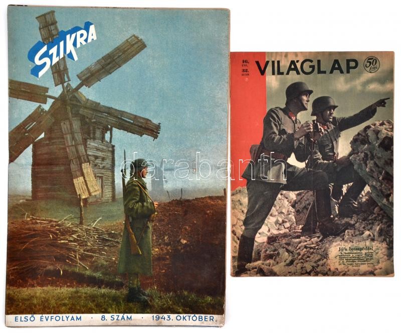 Leírás: 1943-1944 Szikra I. évf. 8. sz. 1943. okt. + Tolnai Világlap. 46. évf. 32 sz. 1944. aug. 9. folyóiratok háborús számai, érdekes fotókkal.
