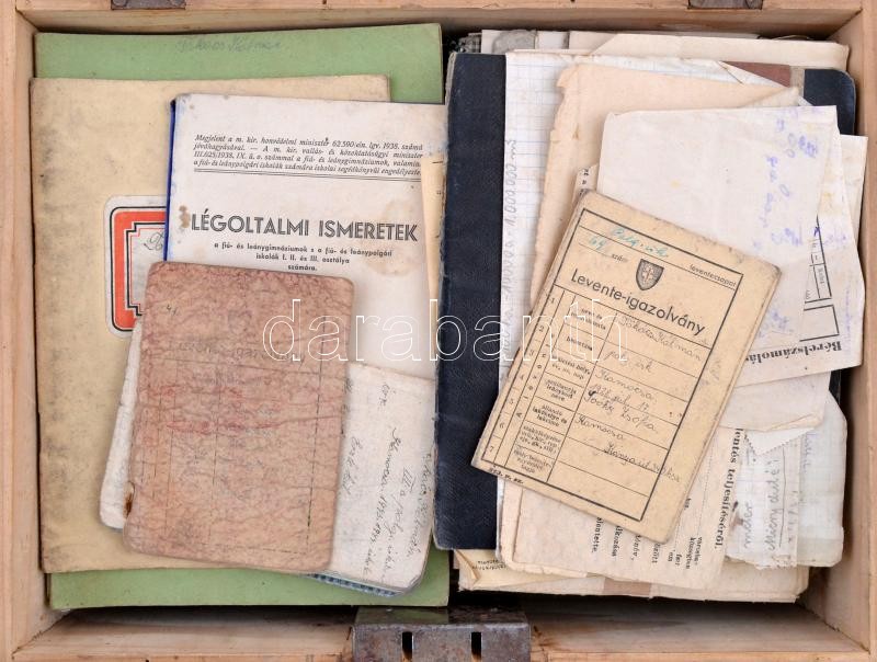 Padláslelet, fa dobozban: iratok, füzetek, levelek, igazolványok. https://www.darabanth.com/hu/354-Gyorsarveres/354.0/Mutargy-papirregiseg-egyeb/Nyomtatvanyok~500030/Padlaslelet-fa-dobozban-iratok-fuzetek-levelek-igazolvanyok~II2023706