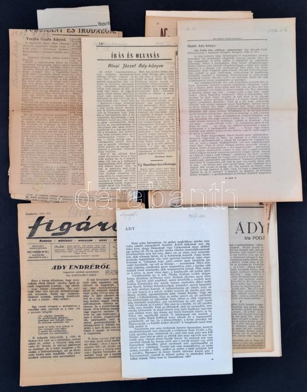 Leírás: cca 1919-1937 Vegyes, Adyval kapcsolatos tétel: cikkek, esszék, 18 db újságkivágás, érdekes, vegyes szemléletű anyag