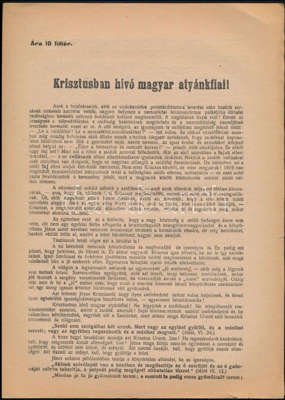 cca 1930-1940 Antiszemita röpirat, 4 p. https://www.darabanth.com/hu/354-Gyorsarveres/354.0/Mutargy-papirregiseg-egyeb/Nyomtatvanyok~500030/cca-1930-1940-Antiszemita-ropirat-4-p~II2024136