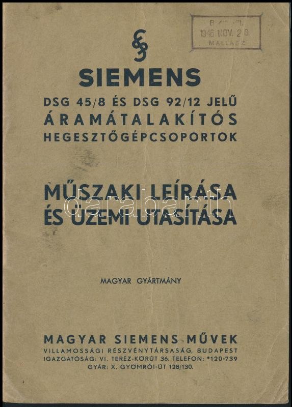 cca 1946 Siemens DSG 45/8 és DSG 92/12 jelű áramátalakítós hegesztőcso... https://www.darabanth.com/hu/354-Gyorsarveres/354.0/Mutargy-papirregiseg-egyeb/Nyomtatvanyok~500030/cca-1946-Siemens-DSG-458-es-DSG-9212-jelu-aramatalakitos-hegesztocsoportok-muszaki-leira~II2018493