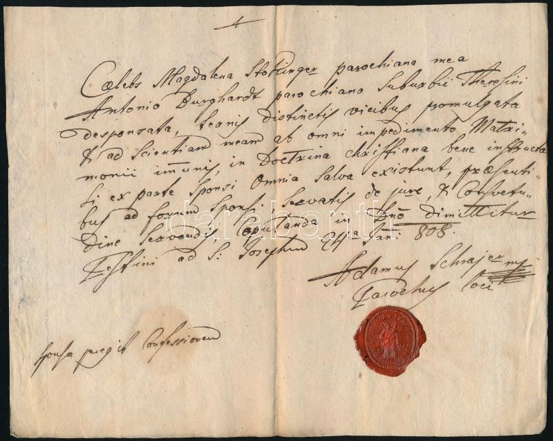 Leírás: 1808 Pest, plébániai házasodási engedély, latin nyelven, rányomott viaszpecséttel