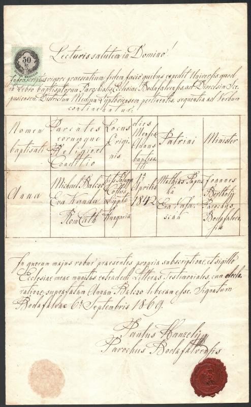 Leírás: 1869 Bodafalu (ma Bodice, Liptószentmiklós), keresztelési anyakönyvi kivonat, latin nyelven, okmánybélyeggel, rányomott viaszpecséttel