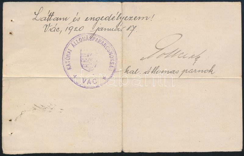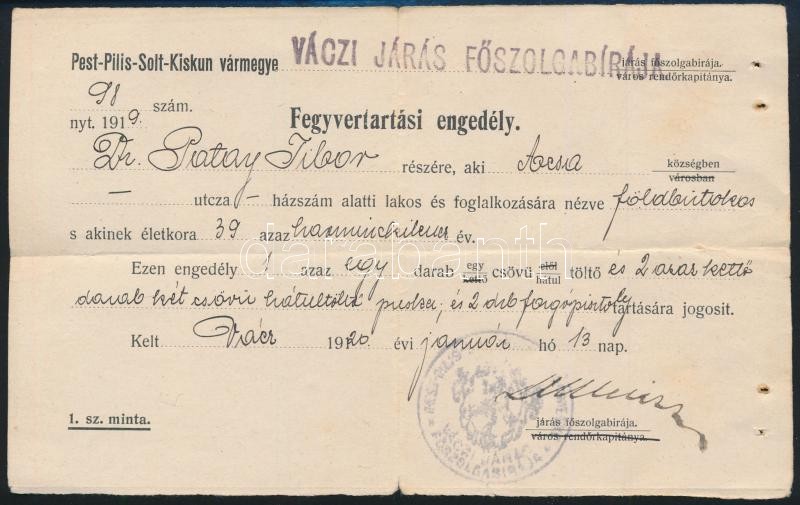 1920 Fegyvertartási engedély Vác. https://www.darabanth.com/hu/354-Gyorsarveres/354.0/Mutargy-papirregiseg-egyeb/Okmanyok~500018/1920-Fegyvertartasi-engedely-Vac~II2023976