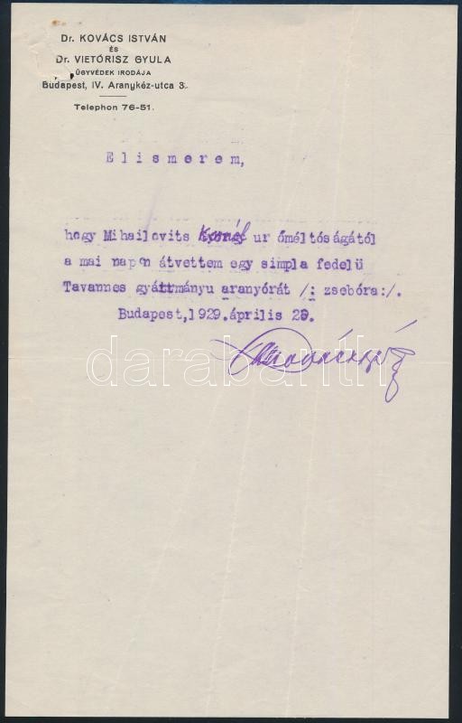 Leírás: 1929 Dr. Kovács István és Dr. Vietórisz Gyula ügyvédi iroda gépelt, aláírt elismervénye Tavannes arany zsebóra átvételéről, fejléces papíron