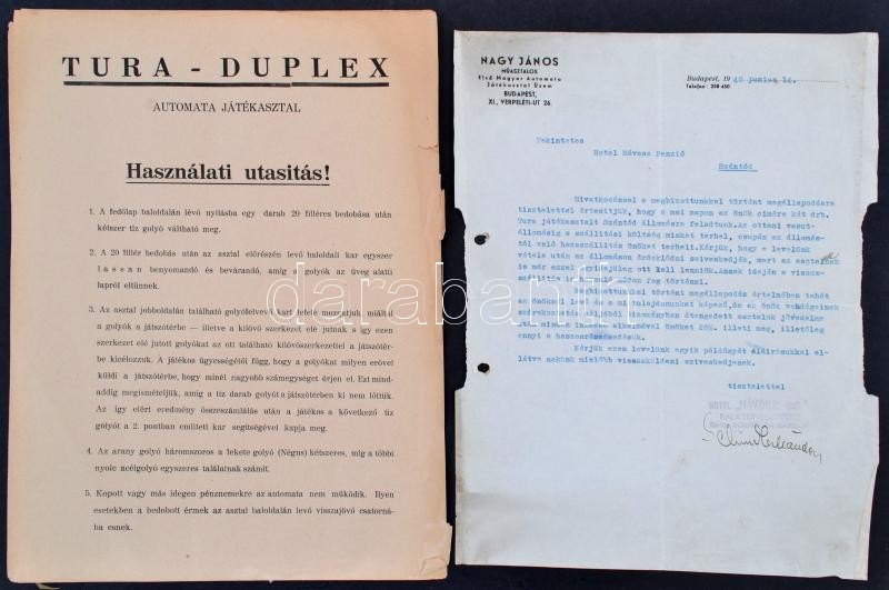 1940 Nagy János műasztalos, Első Magyar Automata Játékasztal Üzem levele a balatonszántódi MÁVOSZ Panziónak 2 db Tura-Duplex játékasztal megküldése tárgyában, fejléces papíron + ismertető leírás