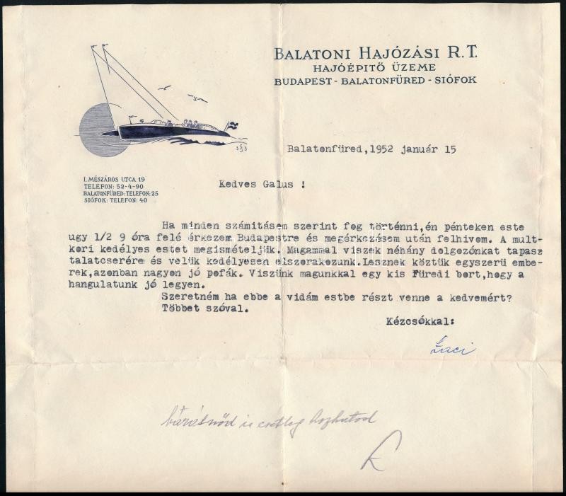 Leírás: 1952 Balatonfüred, Balatoni Hajózási Rt. Hajóépítő Üzemének fejléces levélpapírjára írt levél