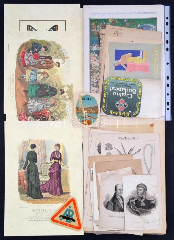 Leírás: Vegyes papírrégiség tétel: régi metszet, lexikonillusztrációk, gobelin minták, hirdetések, stb., érdekes anyag