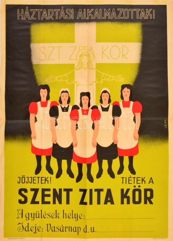 Leírás: cca 1930-1940 Háztartási alkalmazottak! Jöjjetek! Tiérek a Szent Zita Kör, Bp., Klösz-ny., jelzett a nyomaton (Lelkes), hajtásnyommal, 59x42 cm.