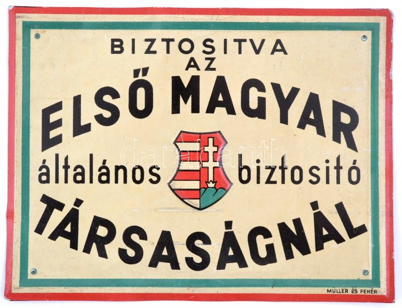 Biztosítva az Első Magyar Általános Biztosítónál. Festett fém tábla Mü... https://www.darabanth.com/hu/354-Gyorsarveres/354.0/Mutargy-papirregiseg-egyeb/Reklam~500022/Biztositva-az-Elso-Magyar-Altalanos-Biztositonal-Festett-fem-tabla-Muller-es-Feher-16-~II2016959