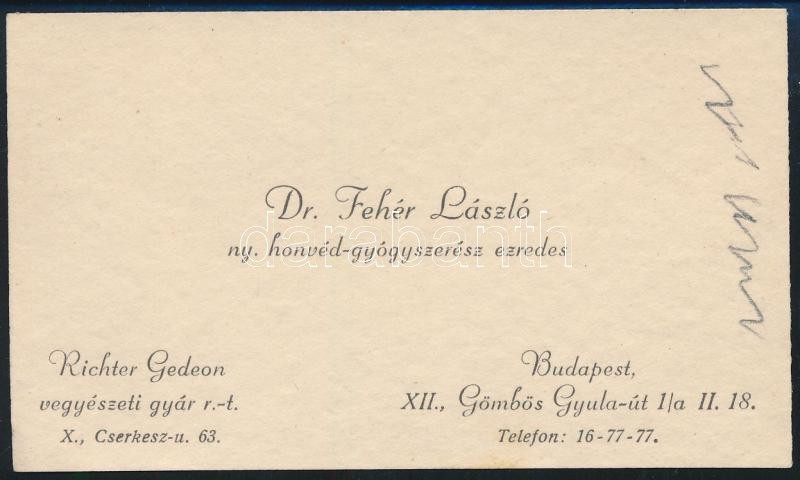 Leírás: Saád István érsekújvári Szent Rókus Gyógyszertárának jegyzettömbje + Dr. Fehér László honvéd gyógyszerész ezredes névjegykártyája