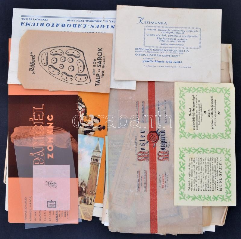 Leírás: Vegyes reklámos papírrégiség tétel: csomagolások, reklámlapok, hirdetések, stb., összesen kb. 50 db