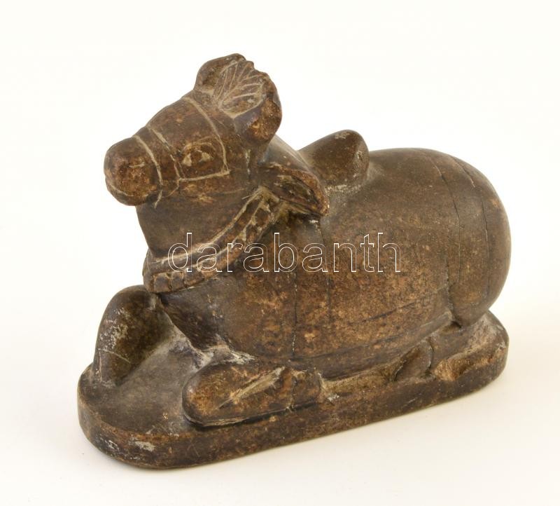 Leírás: Feldíszített tehén figura, faragott zsírkő, jelzés nélkül, apró kopásnyomokkal, m: 10 cm