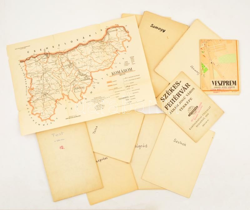 1956-1958 Vegyes megye térkép tétel, 11 db, közte két Somogy térképpel.+ Valamint egy Veszprém és egy Székesfehérvár térkép. Változó állapotban, részben hajtások menti szakadásokkal.