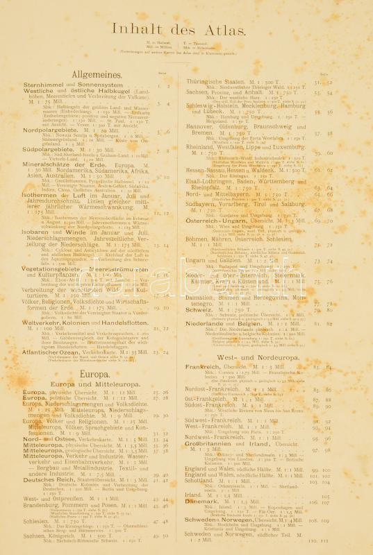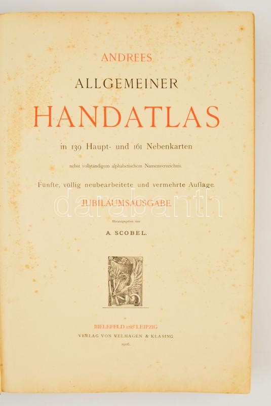 Leírás: Andrees Allgemeiner Handatlas in 139 Haupt- und 161 Nebenkarten. Bielefeld und Leipzig, 1906, Velhagen&Klasing. Ötödik kiadás. Javított gerincű, aranyozott vászon-kötésben, kopottas borítóval.
