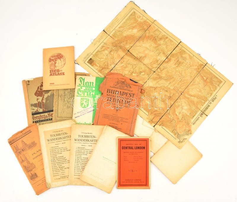 Leírás: cca 1900-1940 Kb 20 db turista térkép, nagyrészt osztrák, de magyarok is, és utcajegyzékek is