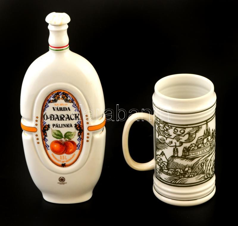Leírás: Hollóházi porcelán kulacs és korsó, matricás, jelzett, kis kopásnyomokkal, m: 25 és 15 cm