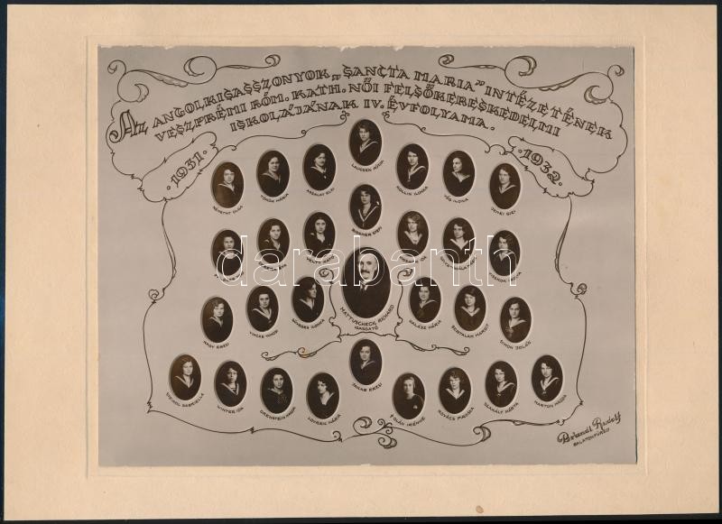 1932 Balatonfüred, Veszprémből kihelyezett Női Felsőkereskedelmi Iskola tanárai és végzős növendékei, kistabló nevesített portrékkal, 16x20,5 cm, karton 20x27 cm