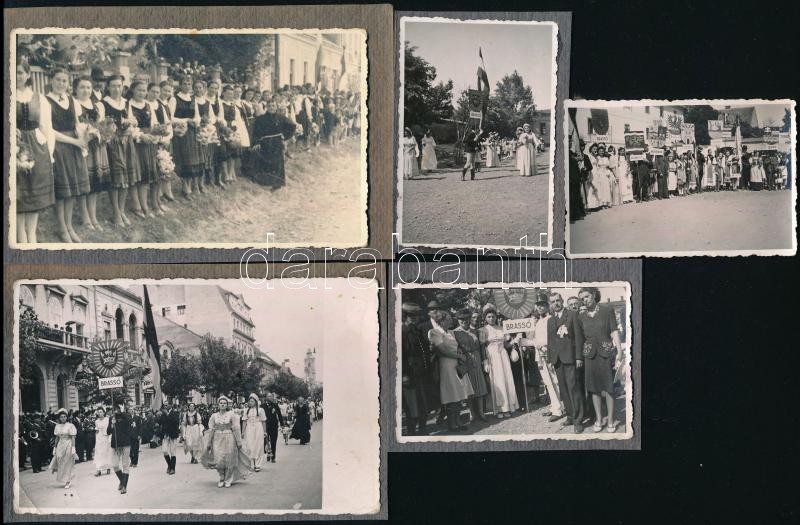 1940 Az erdélyi vármegyék díszfelvonulása a magyar csapatok bevonulása után, főleg a Brassó vármegyei küldöttséggel az előtérben, 5 db fotó, részben kartonra ragasztva, 6×8,5 és 8×13 cm közötti méretekben