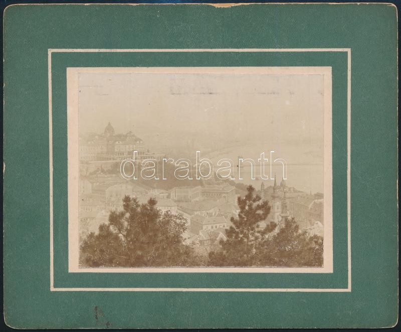 cca 1895 Budai látkép a Tabán Dunához közeli épületeivel, továbbá különösen érdekes a várpalota külső oszlopcsarnoka, amelyet kevés hasonló ábrázoláson figyelhetünk meg, ma pedig egyáltalán nem létezik; jelzés nélküli vintage fotó Kerny István (1879-1963) budapesti fotóművész hagyatékából, 8x10,2 cm, karton 13,4x16,4 cm