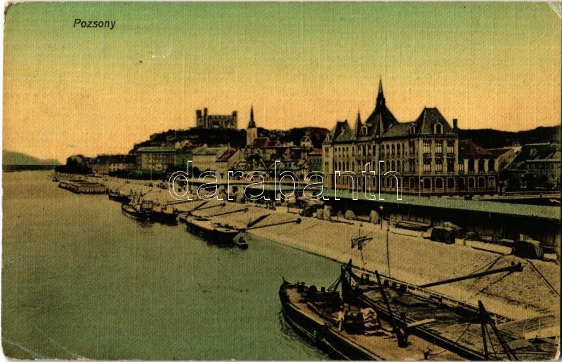 1909 Pozsony, Pressburg, Bratislava; vár, rakpart, uszályok. L. & P. P... https://www.darabanth.com/hu/355-Gyorsarveres/355.0/Kepeslapok/Felvidek~1000007/1909-Pozsony-Pressburg-Bratislava-var-rakpart-uszalyok-L-P-P-castle-quay-barges-ki~II2031610