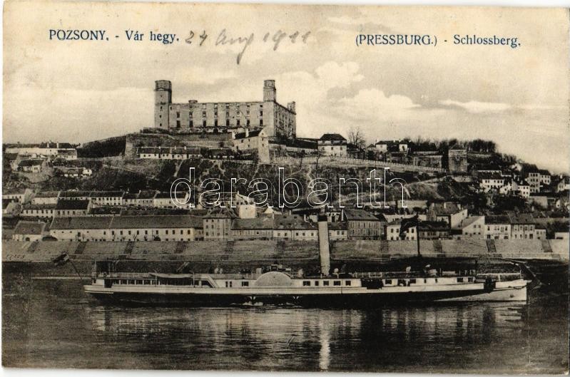Leírás: 1911 Pozsony, Pressburg, Bratislava; Várhegy, "Hildegarde" lapátkerekes gőzhajó / Schlossberg / castle hill, steamship