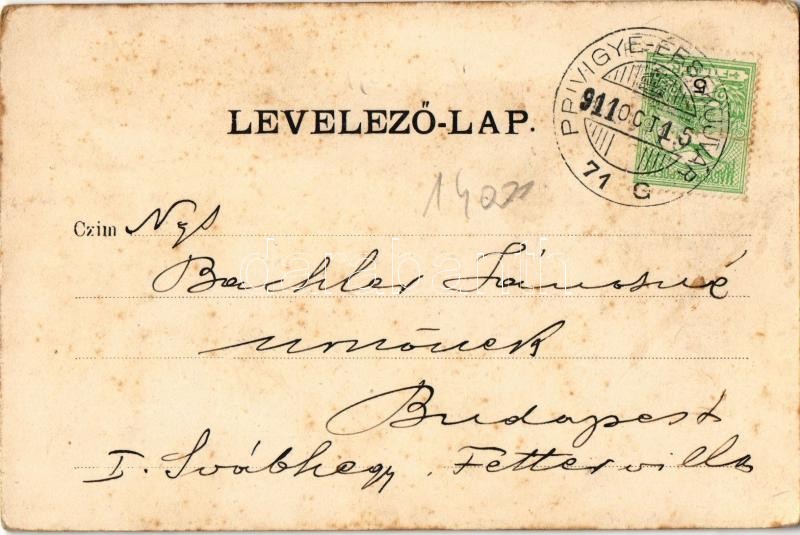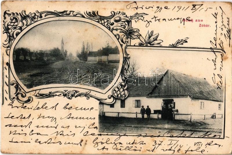 Leírás: 1911 Zohor, Fő utca, üzlet / main street, shop. Art Nouveau, floral + "PRIVIGYE - ÉRSEKÚJVÁR 71 G" vasúti mozgóposta bélyegző (fl)