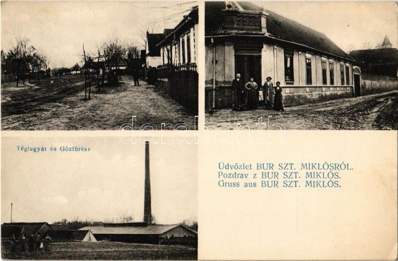 Leírás: 1918 Búrszentmiklós, Bur-Sankt-Niklas, Borsky Mikulás; Fő utca, Kohn Vilmos üzlete, Téglagyár és gőzfűrész, fűrésztelep / main street, shop of Kohn, brick factory, brickyard, steam sawmill (EK)