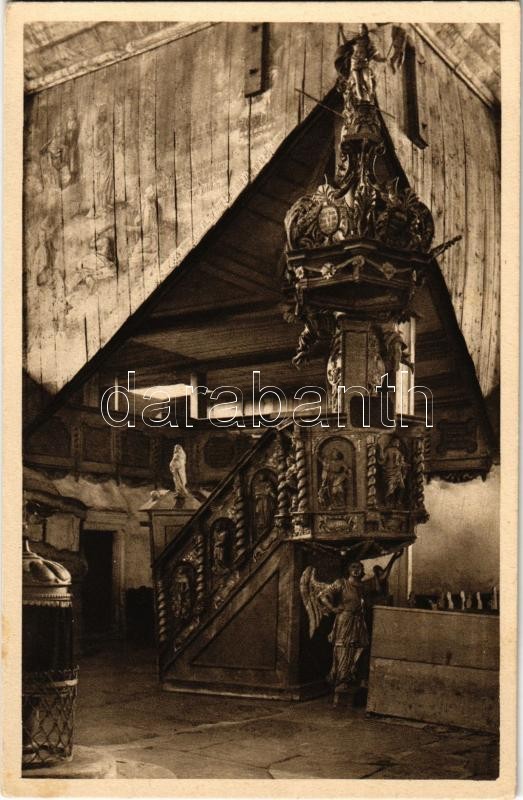 Késmárk, Kezmarok; Die Kanzel der evang. Holzkirche aus dem Jahre 1717. / A szószék az evangélikus fatemplomban / the pulpit in the Lutheran wooden church, interior