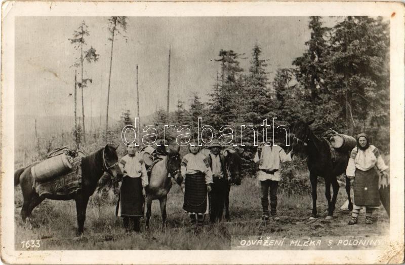 Odvazení mléka, Poloniny / Szlovák folklór, tejszállítás / Slovak folk... https://www.darabanth.com/hu/355-Gyorsarveres/355.0/Kepeslapok/Folklor~1000055/Odvazeni-mleka-Poloniny-Szlovak-folklor-tejszallitas-Slovak-folklore-milk-transport-an~II2031297