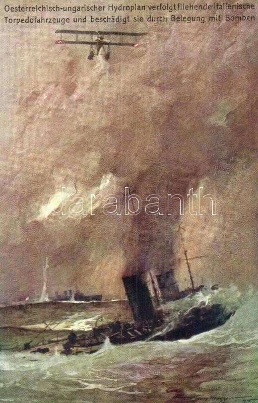 Österreichisch-ungarischer Hydroplan verfolgt fliehende Italienische Torpedofahrzeuge und beschädigt sie durch Belegung mit Bomben. K.u.K. Kriegsmarine Seeflugzeug. Offizielle Karte für Rotes Kreuz. Kriegsfürsorgeamt Kriegshilfsbüro Nr. 158. / WWI Austro-Hungarian Navy seaplane pursue Italian torpedo destroyers and damages them by bombs. s: Harry Heusser
